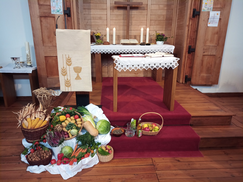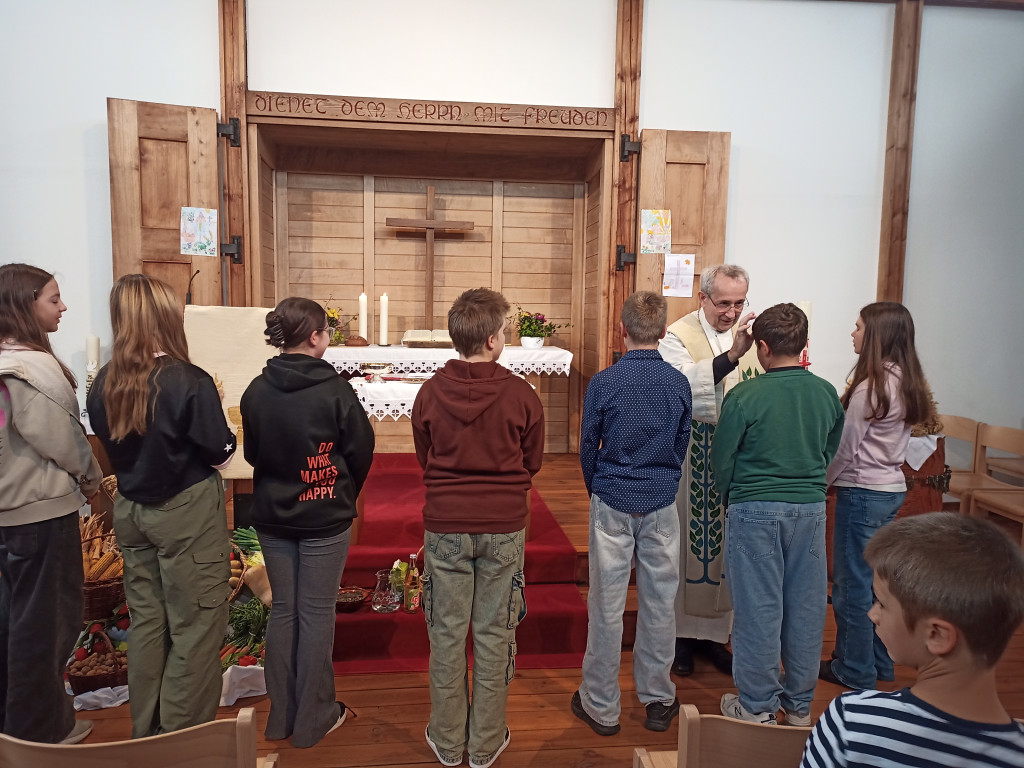 Mit einem fröhlichen Gottesdienst, ganz im Zeichen des Dankes für die Gaben Gottes, wurde der Erntedanksonntag gefeiert. 12 neue Konfirmationsbewerber stellten sich der Gemeinde vor und halfen eifrig mit bei der Gestaltung des Gottesdienstes. Sie brachten eine Schale mit Erde, einen Krug voll Wasser, Kaffe und Limo, eine Harke sowie einen Korb Obst zum geschmückten Erntealtar. All diese Gaben sind den Menschen von Gott geschenkt, dafür galt es zu danken und würdig umzugehen. Nachdenkliche Worte fand Pfarrer Gemkow dann in seiner Predigt, angelehnt an das Evangelium nach Lukas, 12, 15-21. "Lasst und nicht immer noch größere Scheunen bauen" meinte er. Nur das Leben im Hier und Jetzt haben wir in der Hand und dieses sollten wir jeden Tag bewusst leben! Die Buben und Mädchen trugen die Fürbitten vor und erhielten zum Abschluß einen persönlichen Segen von Pfarrer Gemkow.